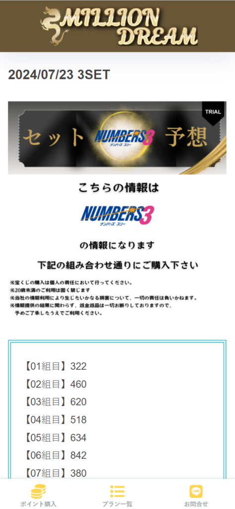 | 2024/07/23 | ナンバーズ3セット予想 | 64,800円 |